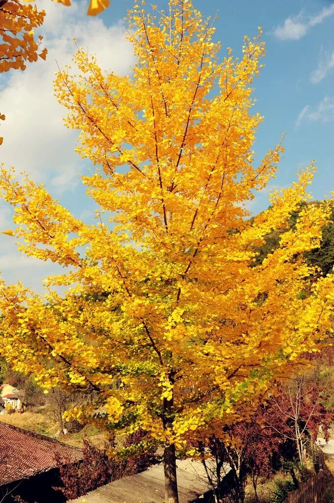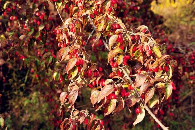 下图:下面树木上果实就是山萸,如同枸杞一颗颗挂在枝头。这是一种中药材,主要对肝、肾有良好的滋补作用。