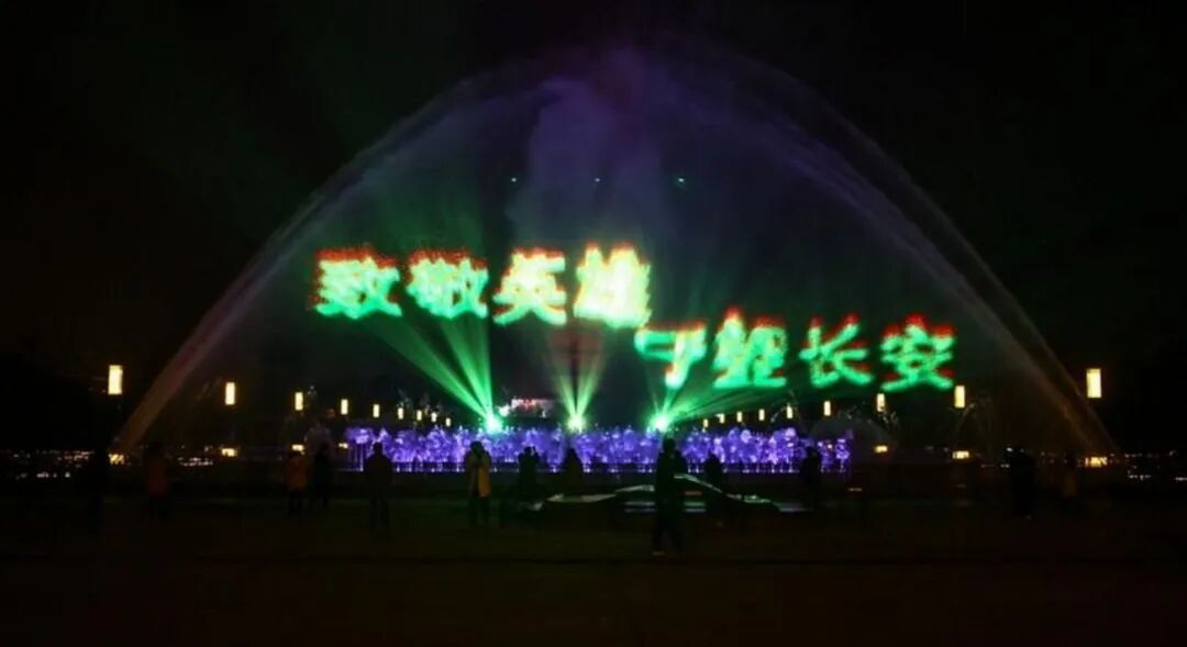 作为陕西首批开放的景区之一,大雁塔北广场用水幕打出了“致敬英雄守望长安”的标语。